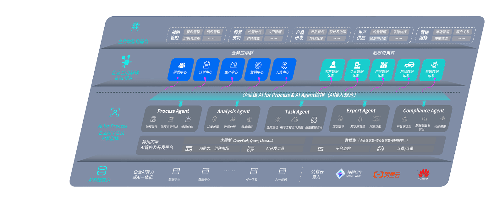 端到端的一站式AI工作空间深度融合了从企业战略规划到日常经营的全流程业务板块,,,定向解决车企内部领域多、、、部门多、、、链条长、、场景碎片化等难题,,,支持车企快速构建以AI为核心的生产力写作体系,,实现任务执行与AI能力的无缝集成与交互