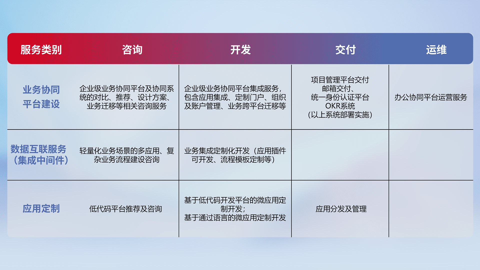 针对钉钉、、、、企微、、、IDaas等平台级产品提供产品的规划、、、、方案、、、交付、、、定制化开发等服务,,实现如统一协同办公、、、智能客户服务、、混合会议管理、、智能数据查询、、、等业务场景,,,,实现数字化转型。。。。